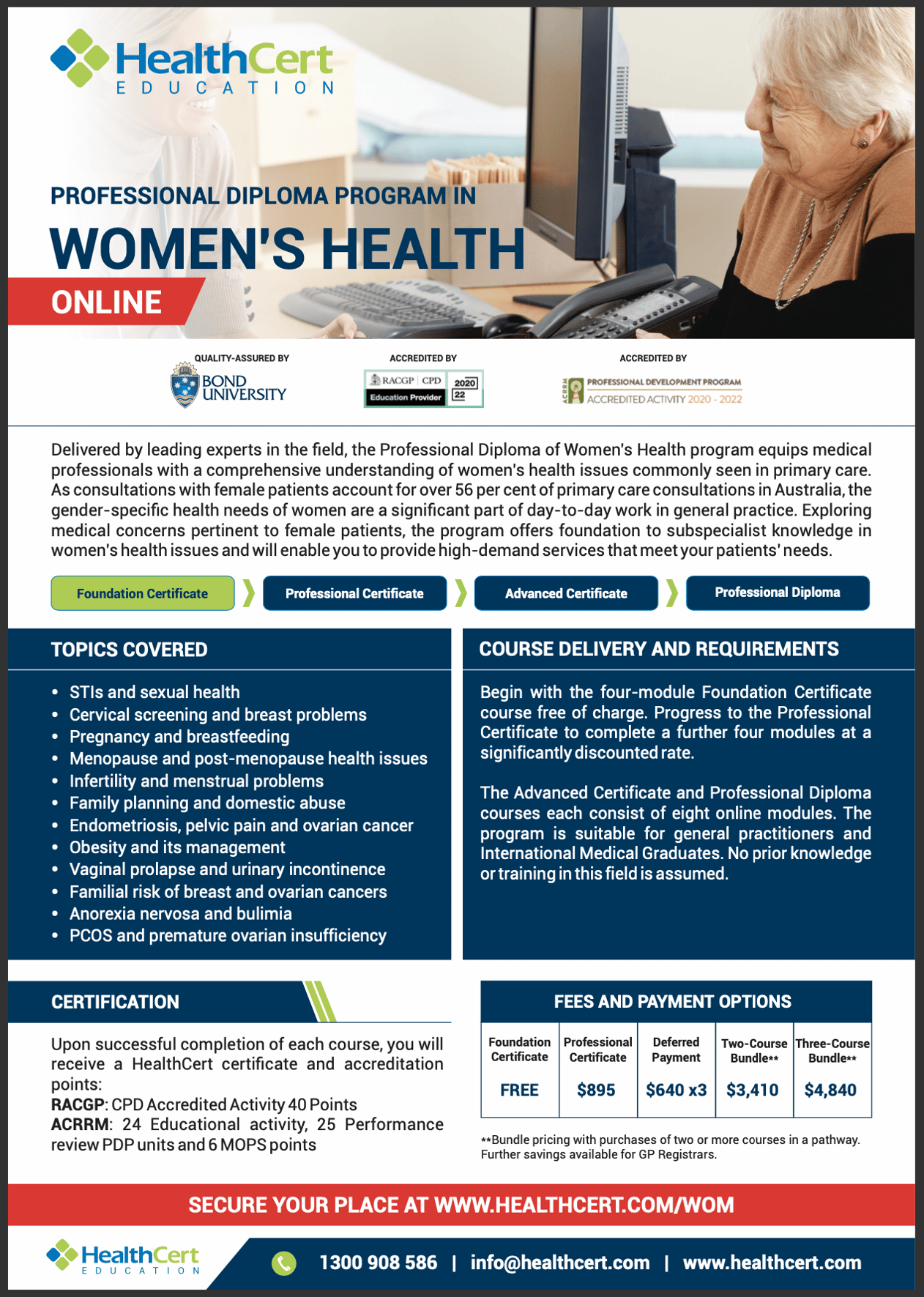 The Advanced Certificate of Womens Health is tailored for medical doctors who wish to improve patient outcomes by managing common womens health issues in general practice. The Companys principal activity is specialised. The Company current operating status is live and has been operating for 17 years.